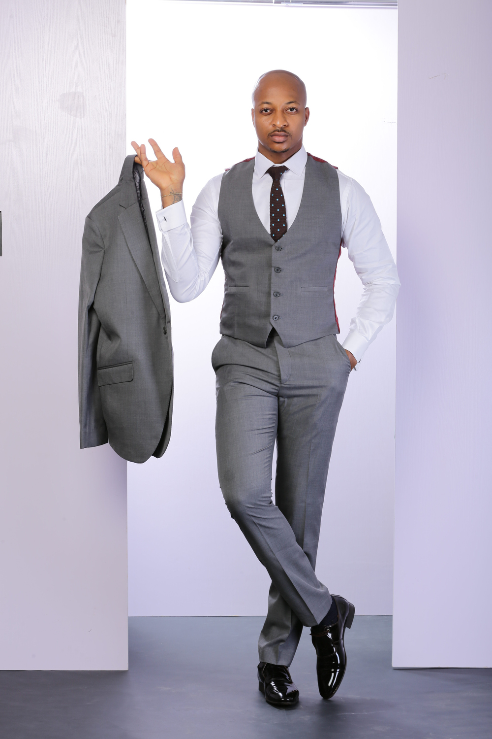 A grey Fitted Suit